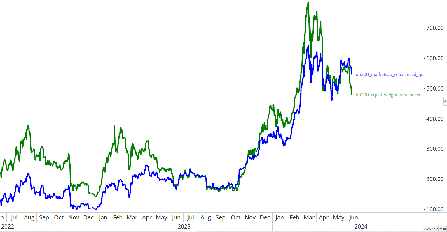 Kryptoaktiva s menší kapitalizací dostávají od letošního března pořádně zabrat. V posledních třech měsících se index Top 200 s rovnoměrnou váhou propadl o 33 % oproti indexu Market Cap, který klesl o zhruba 12 %.