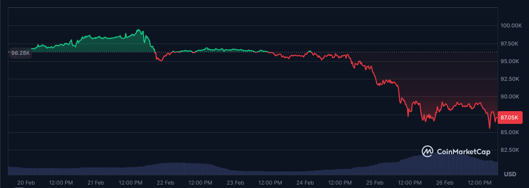 Cena Bitcoinu (BTC) klesla nejníže za 3 měsíce! Úterní minima zašla pod 87 000 dolarů