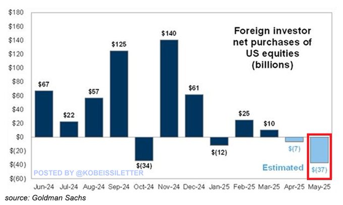 Děje se to i přes zotavení trhu a 90denní pozastavení recipročních cel, které začalo 10. dubna. Cizinci se stahují z amerických akcií.