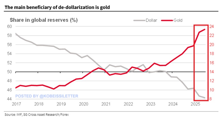 Podíl zlata na globálních rezervách dosáhl ve 2. čtvrtletí 2025 23 %, což je nejvyšší úroveň za 30 let. Za posledních 6 let se toto procento zdvojnásobilo. Zároveň se podíl amerického dolaru na mezinárodních rezervách snížil o 10 procentních bodů na 44 %, což je nejnižší hodnota.