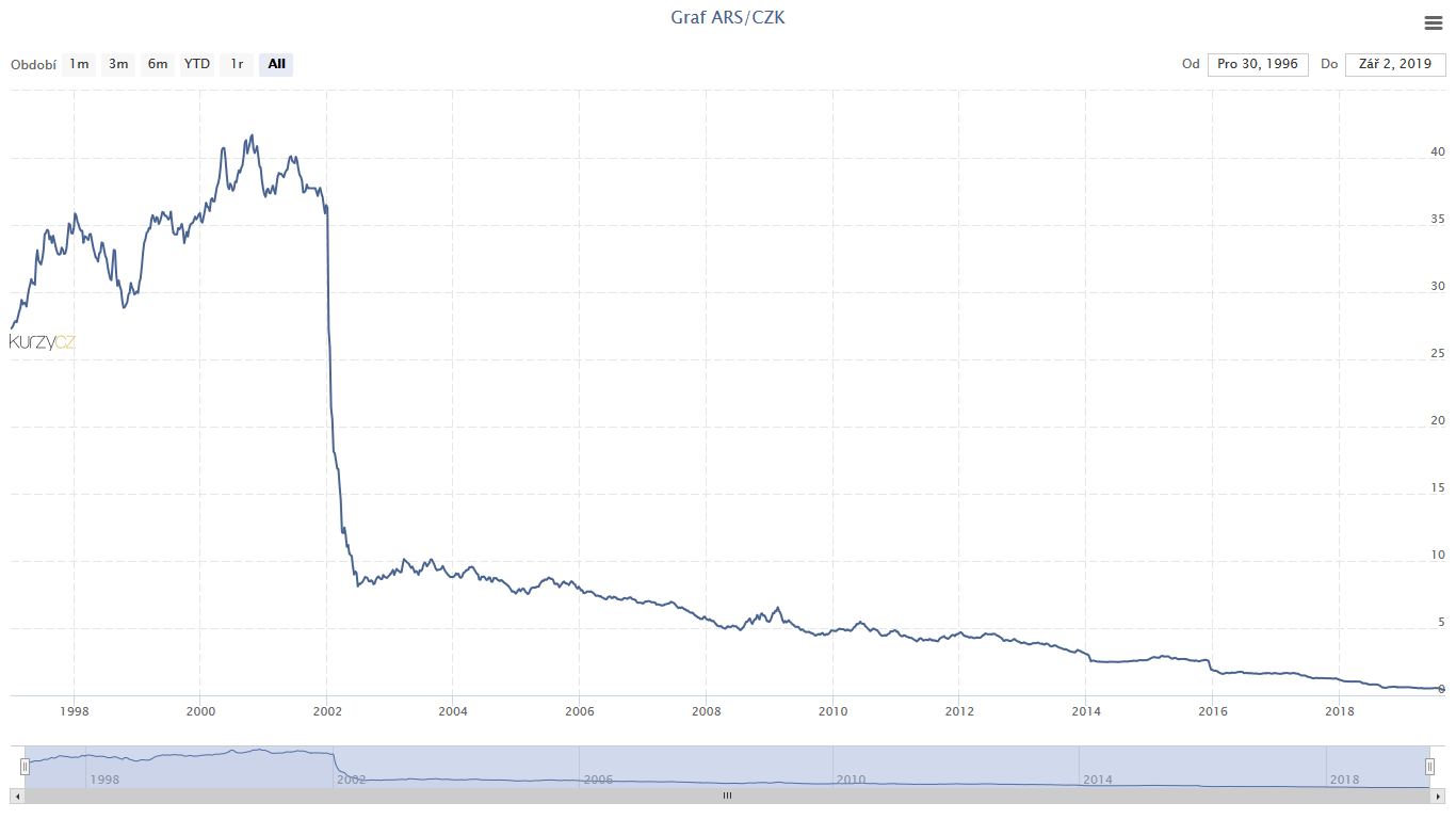 Nastal kolaps ekonomiky i státní měny. Peso ztratilo asi 80 % své hodnoty, lidé chudli obrovskou rychlostí, země se zmítala v problémech a na ulicích se zvýšilo násilí. Na grafu výše vidíte strmý propad, ke kterému tehdy došlo. Od té doby však hyperinflace stále klepe na dveře, lépe řečeno se plíží do dveří. V roce 2001 mělo peso hodnotu okolo 40 Kč, v roce 2002 necelých 9 korun, v roce 2019 0,4 Kč…