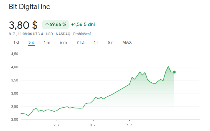 Za posledních 5 obchodních dní akcie veřejně obchodované platformy digitálních aktiv zaměřené na strategie správy a stakingu na bázi Etherea prudce rostly. Podle Google Finance růst Bit Digital (BTBT) za toto období dosáhl cca 70 %.