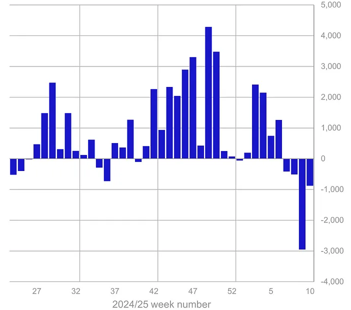 Důsledkem toho je, že nyní, po 4 týdnech bolesti, odteklo z krypto fondů celkem 4,75 miliardy dolarů. Celkový meziroční příliv do těchto produktů tak klesl na 2,6 miliardy dolarů.