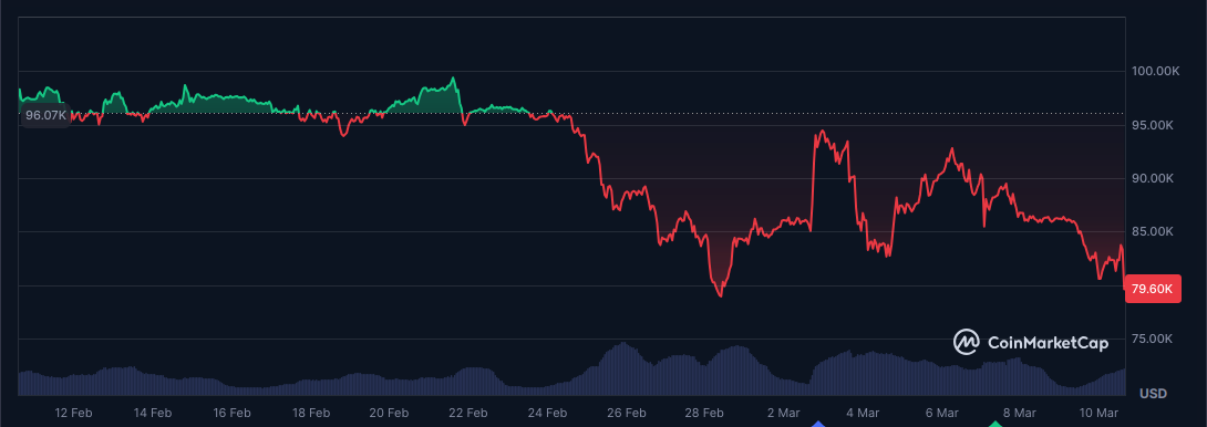 Během posledních 24 hodin Bitcoin ztratil zhruba 5% a za sedm dnů se propadl asi o 15 %. Na cenu mělo vliv několik faktorů v čele s odlivy z bitcoinových ETF fondů. Vliv má i celní válka Donalda Trumpa a v neposlední řadě vystřízlivění trhu ohledně Trumpova plánu na krypto rezervy.