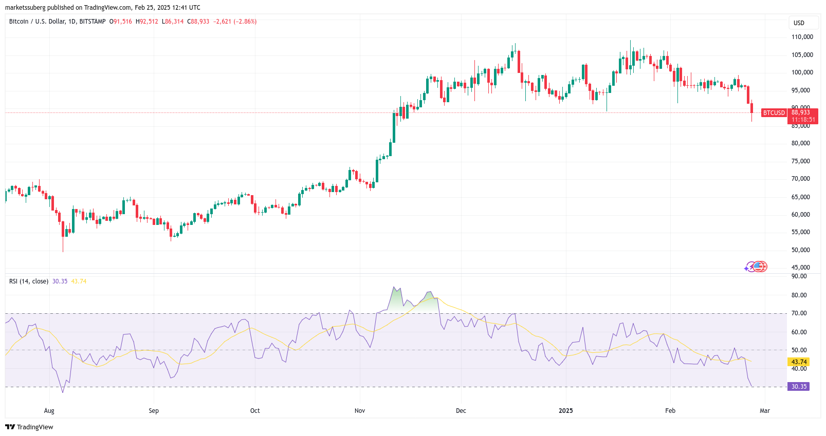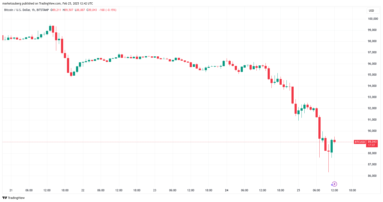 Bitcoin klesl na burze Bitstamp na pouhých 86 314 USD, což je nejnižší cenovka od 15. listopadu 2024. Tržní sentiment, měřeno pomocí indexu strachu a chamtivosti, se tak obrátil k „extrémnímu strachu.“
