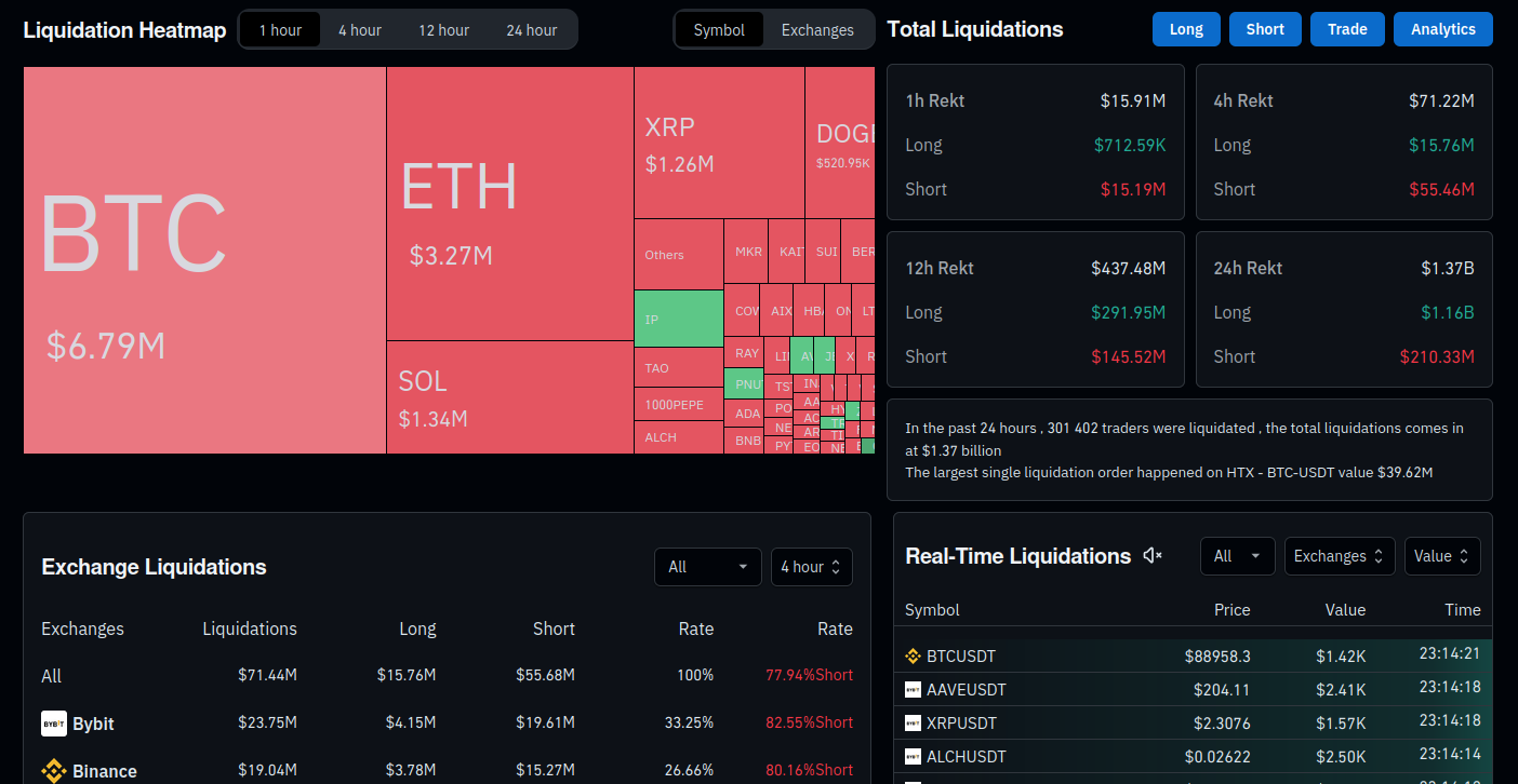 Likvidace pákových pozic při propadu dosáhly 1,37 miliardy dolarů za posledních 24 hodin, podle údajů z monitorovacího zdroje Coinglass. Většina z toho připadá na longy na Bitcoin. Zlikvidováno bylo přes 300 tisíc traderů.