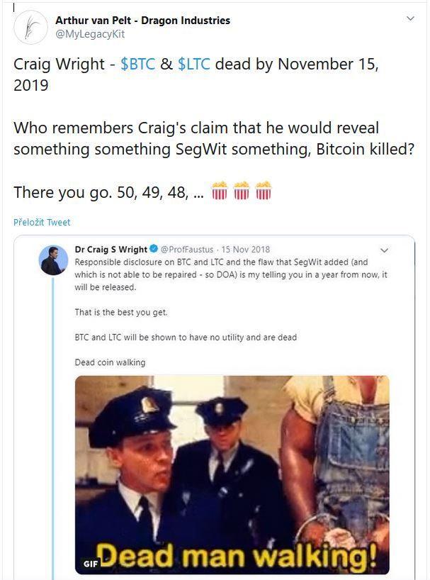 V listopadu 2018, samozvaný tvůrce Bitcoinu, Craig Wright předpověděl, že kryptoměny BTC a LTC budou do roka mrtvé. Komunita na Twitteru mu nyní jeho předpověď připomíná.