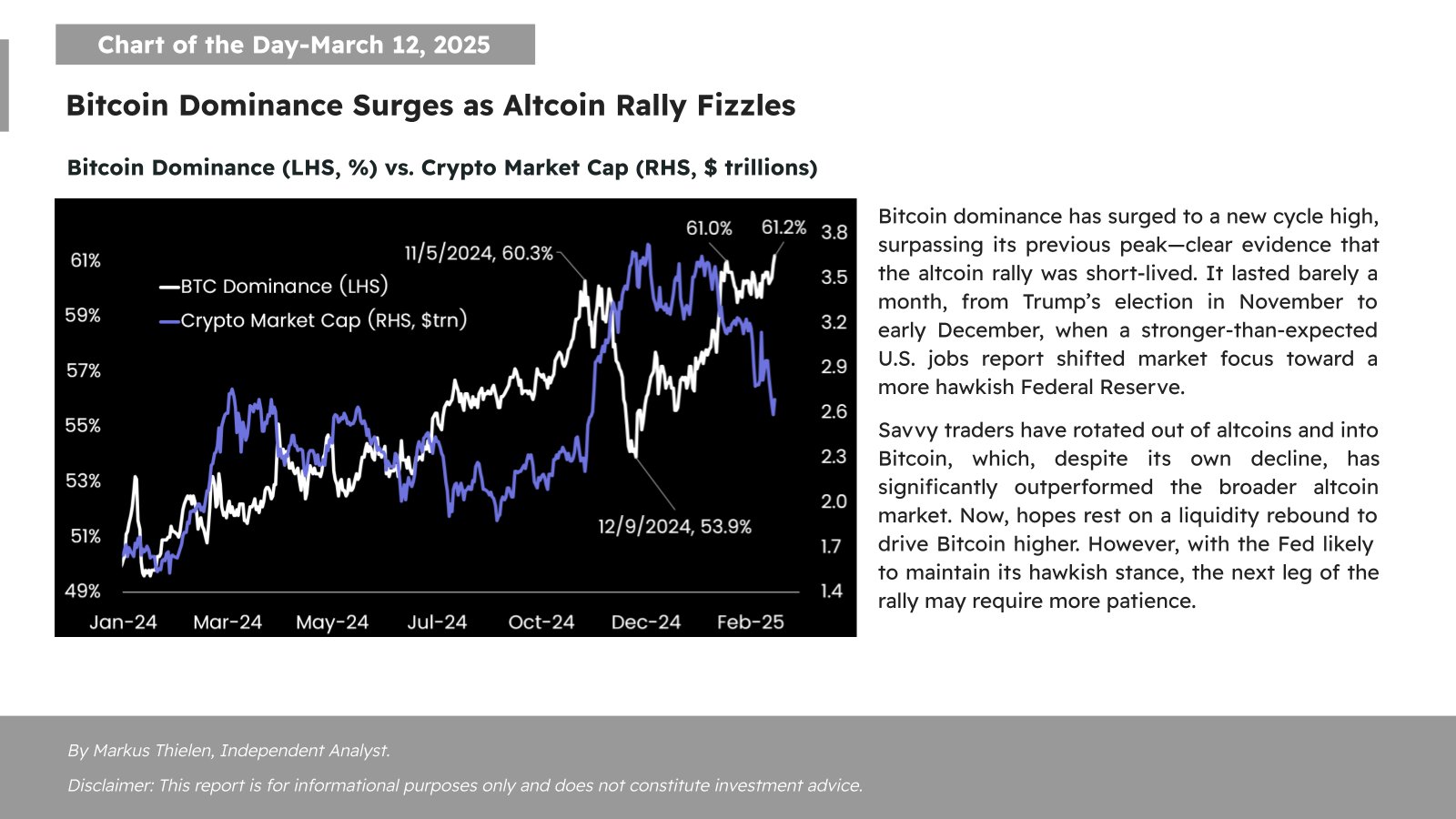Podle dat zveřejněných asijskou krypto platformou Matrixport dominance Bitcoinu – míra podílu kapitalizace BTC na celkové tržní kapitalizaci kryptoměn – dosáhla 61,2 %. Jde o dosažení nového maxima po stanovení dosavadního minima tohoto cyklu na hodnotě kolem 54 % v prosinci.