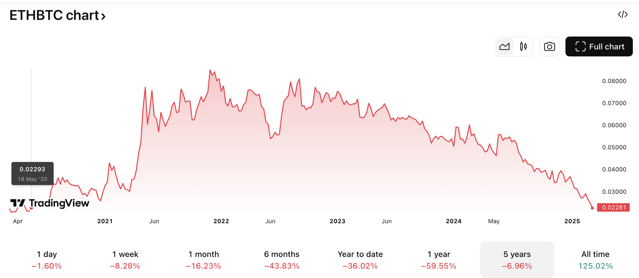 Současná hodnota cca 0,02281 je tak nejnižší úroveň kurzu ETH/BTC za téměř pět let. Někteří analytici se proto nyní obracejí na graf a zvažují, zda dosažení tohoto low povede k odrazu a růstu Etherea oproti největší kryptoměně.