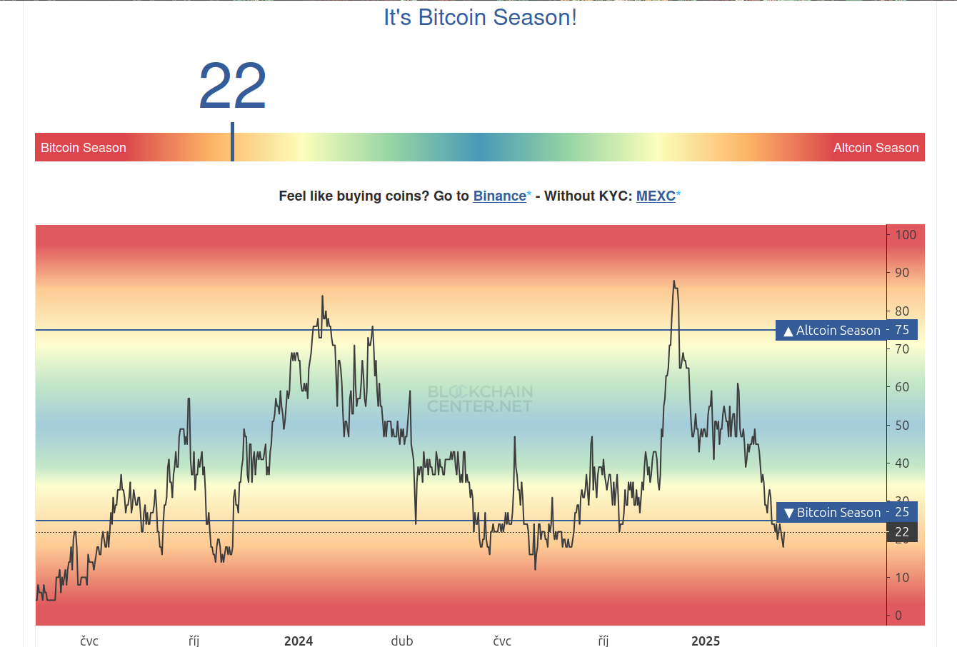 Podle indexu Altcoin Season Index aktuálně probíhá bitcoinová sezóna, která začala na začátku měsíce. Trh je tak v tuto chvíli nejdále od altcoinové sezóny, jak to jen jde.