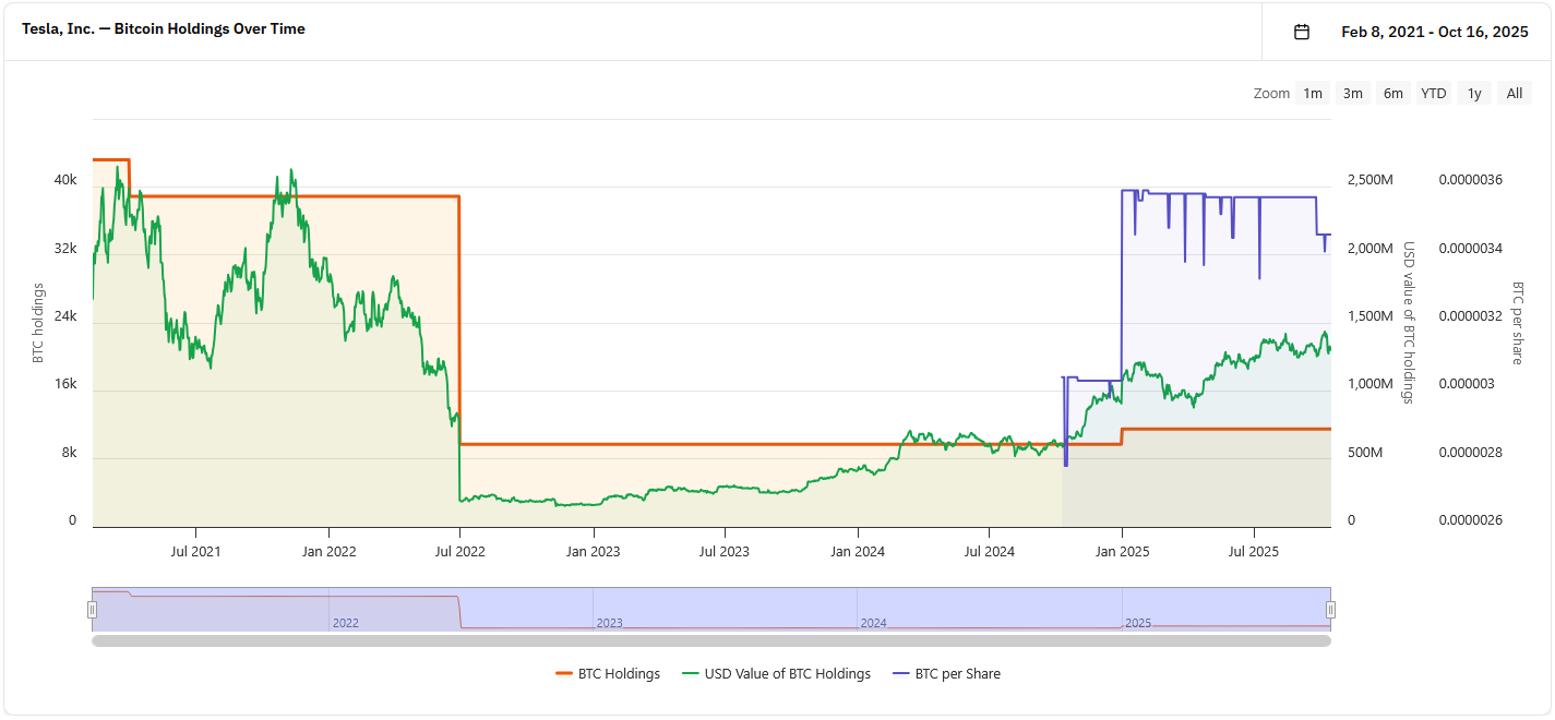 Muskova Tesla má od roku 2021 bitcoinové rezervy, začínala na 43 200 BTC, ale zhruba do poloviny roku 2022 se většiny mincí zbavila a v současné době drží 11 509 BTC s průměrnou pořizovací cenou 33 539 USD za jednotku.