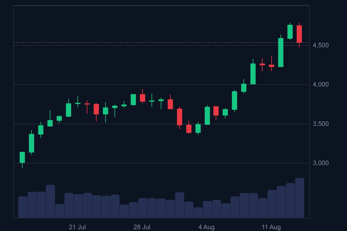 Ve čtvrtek odpoledne se Ethereum po určité korekci růstu, který přesáhl tisíc dolarů za 7 dní, aktuálně obchoduje kolem cenovky 4 550 dolarů.