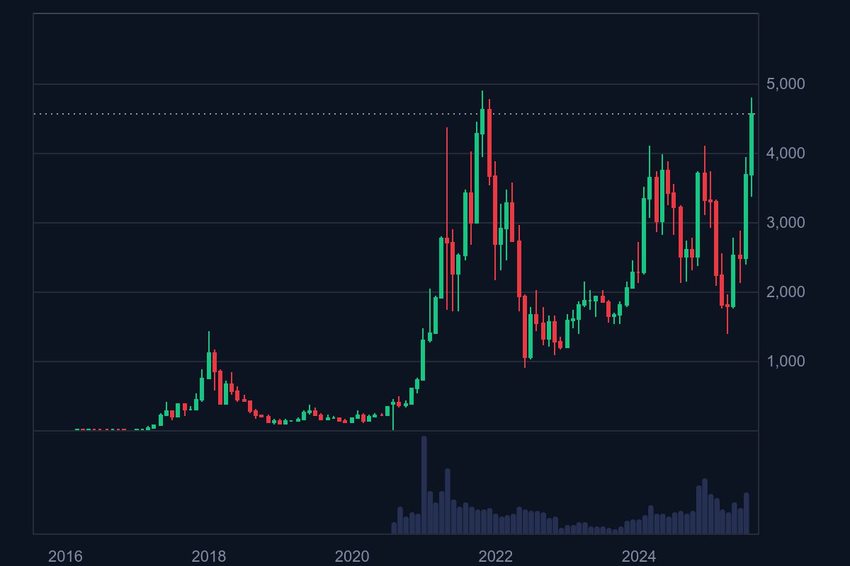 Cena Etherea (ETH) se ve středu vyšplhala na dosah svých předešlých maxim z roku 2021 na úrovni cca 4 892 dolarů za jednotku. Na hodnotě cca 4 785 dolarů se prudké zvyšování ceny zastavilo..