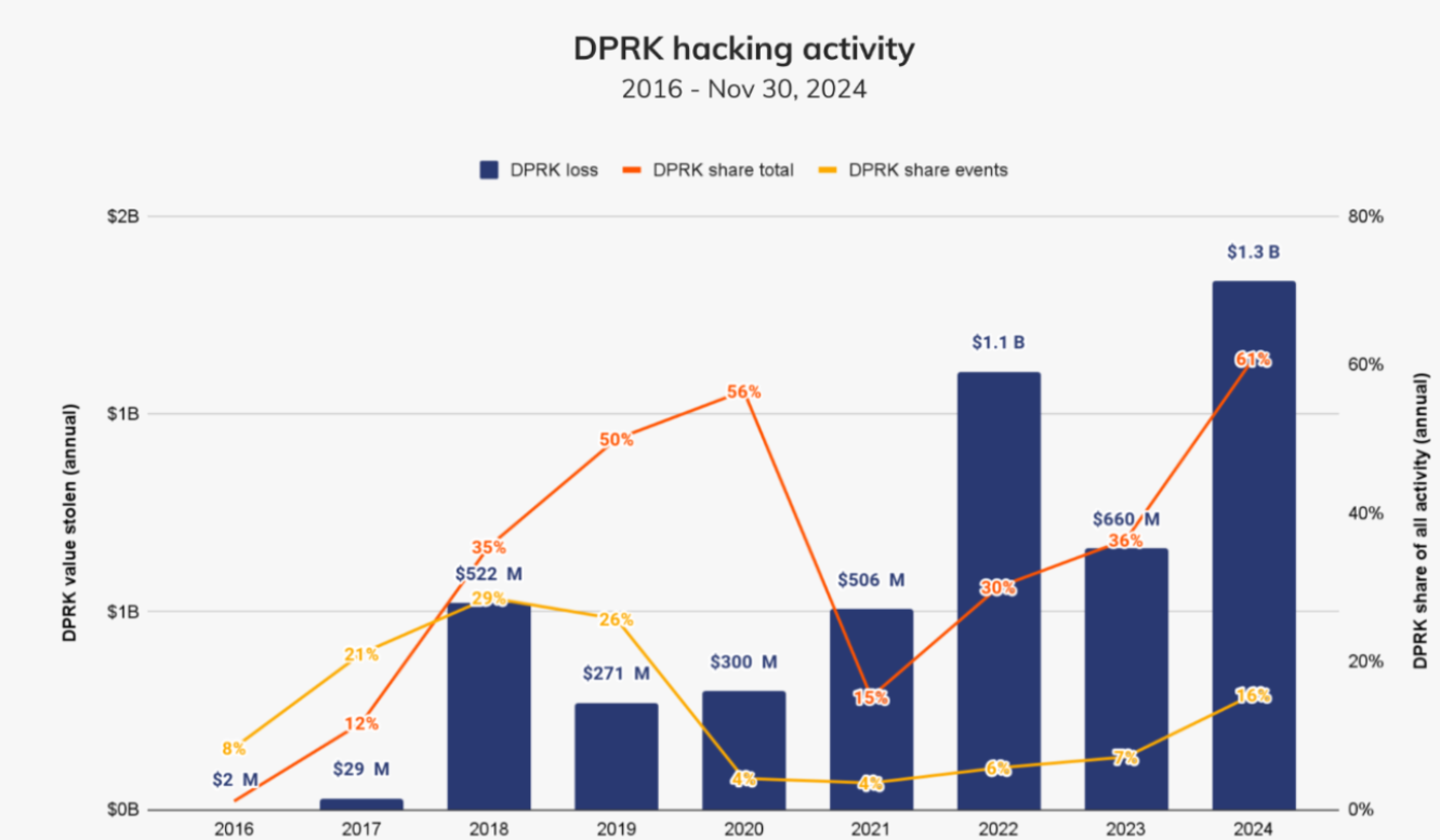 Graf níže zobrazuje alarmující růst hackerské aktivity Severní Koreje podle dat společnosti Chainlysis. Tamní hackerské útoky jsou podle údajů zodpovědné za 61 % z celkového odcizeného krypta v roce 2024.