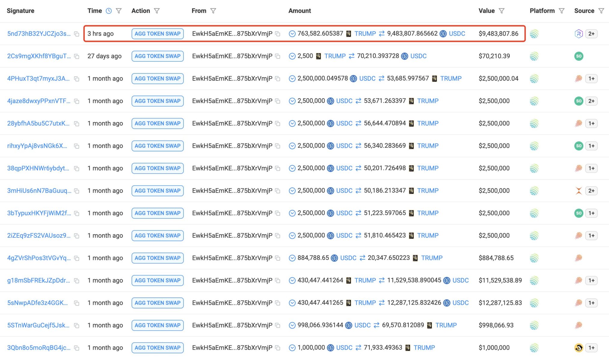 Jak uvedla on-chain analytická společnost LookOnchain, ztráta neznámého obchodníka dosáhla cca 24,4 milionu USD. Velryba do pozice vstoupila asi před měsícem, kdy nakoupila 763 582 tokenů Trump za 33,9 milionu USD. Prodejem z této částky získala zpět jen přibližně 9,48 milionu USD.
