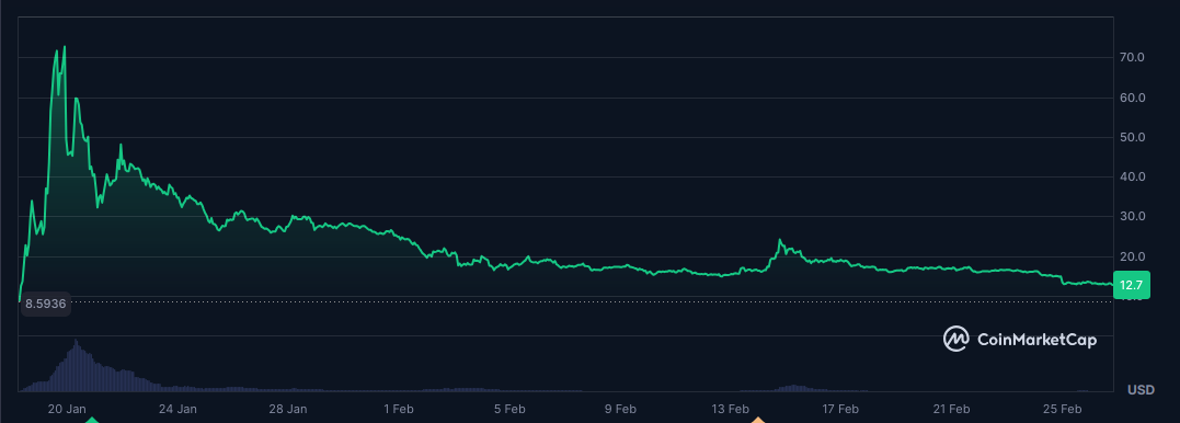 V předvečer Trumpovy inaugurace token dosáhl historického cenového maxima na hodnotě cca 73,5 USD. Od té doby postupně klesá, přičemž při současné cenovce 12,7 USD již přišel o cca 83 % své někdejší hodnoty.