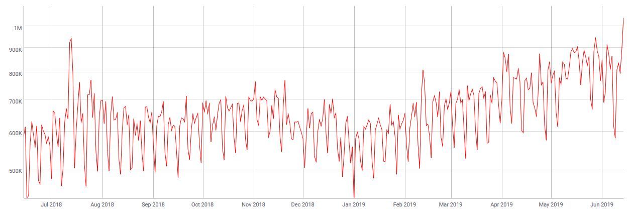 Zaznamenali jsme více než roční maximum v počtu aktivních bitcoinových peněženek za den. Jak můžete vidět i na grafu níže, tak milník milion aktivních Bitcoinových peněženek za den byl nedávno překonán. To je další výrazný indikátor, který svědčí o aktuální síle Bitcoinu. Skutečně se dá říct, že Bitcoin je letos ve skvělé formě. Doufejme tedy, že mu síly vydrží. (ATH cca 1,17 mil. z prosince 2017 však zatím drží.)
