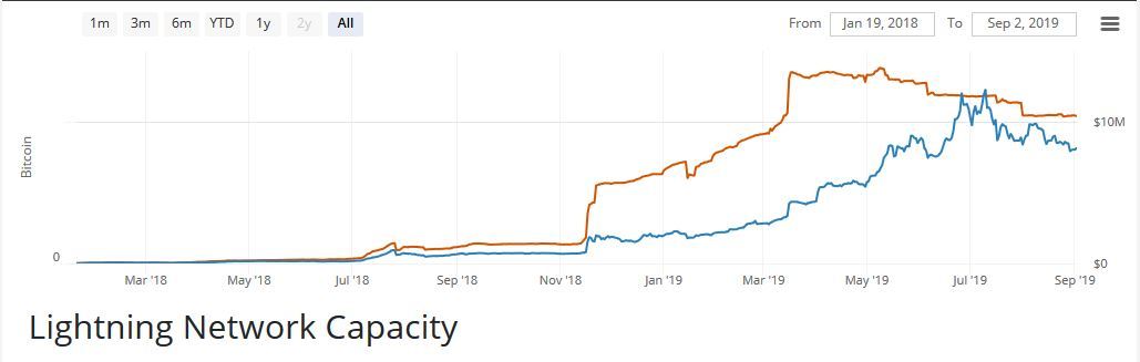 Lightning Network má momentálně kapacitu asi 830 BTC. Dosavadní maximum využití zaznamenal v květnu, kdy se kapacita vyšplhala až lehce nad 1100 BTC. Rozsah využití LN v průběhu času vidíte na grafu výše (modře je pro srovnání dolarová hodnota).