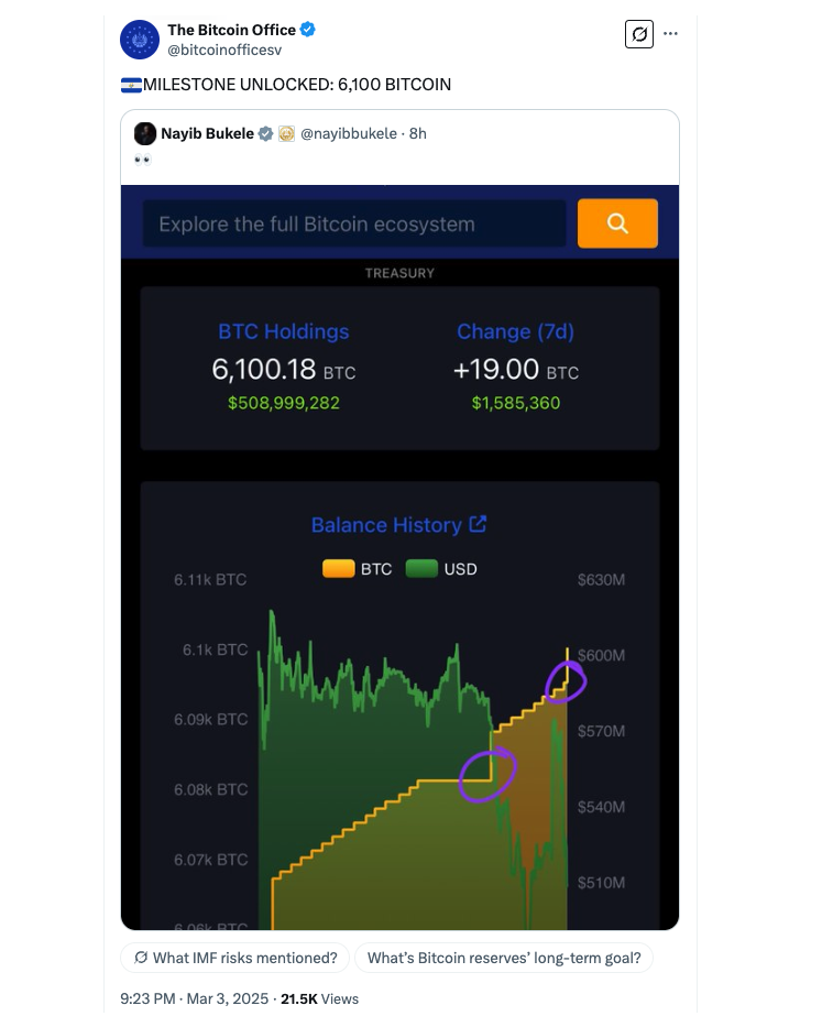 Bertolo odkazuje na dřívější dohodu, v rámci které Salvador, první země na světě, která přijala BTC jako zákonné platidlo, zrušil povinnost podniků přijímat k platbám BTC. Důvodem těchto kroků je údajně snaha zmírnit potenciální rizika související s bitcoiny.