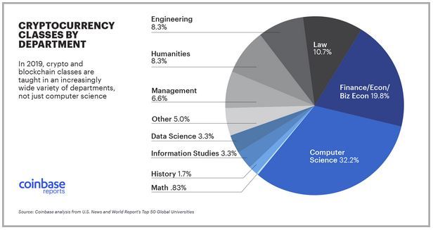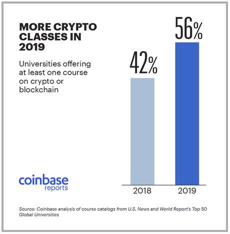 „Dvakrát tolik studentů než v roce 2018 uvádí, že absolvovali kurz krypta nebo blockchainu. Téměř 70 procent tříd kryptografie a blockchainu je v odděleních mimo informatiku, včetně práva, humanitních věd a ekonomiky. Původní výzkum Coinbase zahrnuje průzkum mezi 735 americkými studenty ve věku 16 let a starší, komplexní přehled kurzů na 50 mezinárodních univerzitách.”