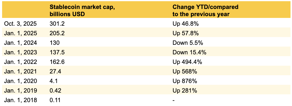 Celková tržní kapitalizace stablecoinů, které jsou spíše on-chain zastoupením bankovních měn než kryptoměnami v pravém slova smyslu, podle agregátora dat DefiLlama poprvé překročila 300 miliard dolarů v pátek a nadále se drží nad touto historickou hodnotou po meziročním růstu blížícímu se 50 procentům.