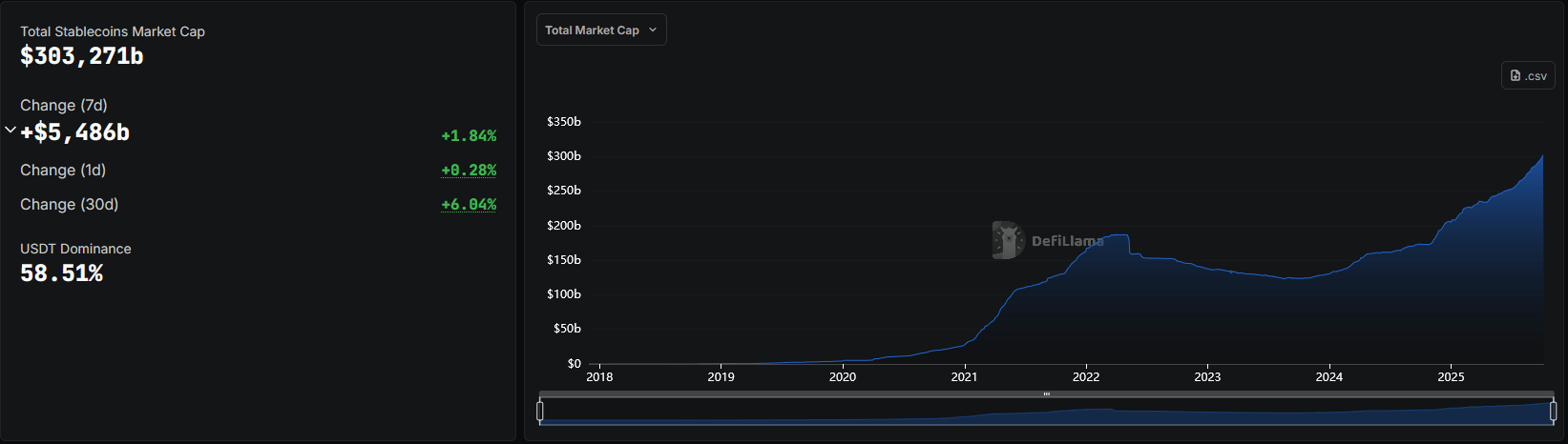 Celková tržní kapitalizace stablecoinů, které jsou spíše on-chain zastoupením bankovních měn než kryptoměnami v pravém slova smyslu, podle agregátora dat DefiLlama poprvé překročila 300 miliard dolarů v pátek a nadále se drží nad touto historickou hodnotou po meziročním růstu blížícímu se 50 procentům.