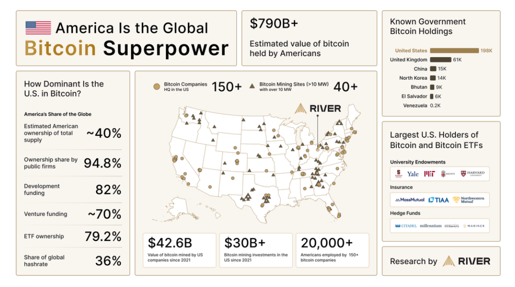 Podle dat bitcoinové burzy River je BTC nyní „rozvíjejícím se rezervním aktivem Ameriky.“ Obyvatelé Spojených států nyní vlastní přibližně 40 % celkové nabídky přední kryptoměny, uvádí zpráva.