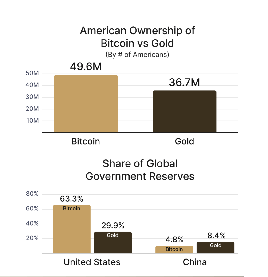 Do roku 1971 bylo zlato primárním rezervním aktivem Spojených států, které podporovalo hodnotu amerického dolaru a sloužilo jako důvěryhodný uchovatel hodnoty pro mnoho Američanů. Ačkoli zlato zůstává důležitým investičním aktivem, jeho role se v průběhu času zmenšila. Bitcoin nyní v počtu vlastnictví mezi jednotlivými Američany překonal zlato.